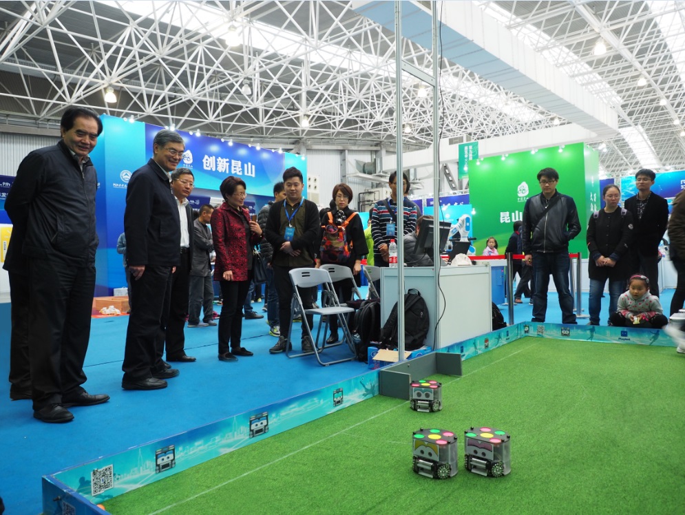 作為昆山智能制造展團(tuán)的核心,浙江大學(xué)昆山創(chuàng)新中心此次共有小型足球機(jī)器人、迎賓機(jī)器人、在線式余(總)氯檢測儀、手持式分光輻射照度計(jì)、在線式超低量程濁度儀、便攜式綠色通道檢測儀等展品參展,充分體現(xiàn)了創(chuàng)新中心科研成果的轉(zhuǎn)化落地,尤其是小型足球機(jī)器人比賽,集科學(xué)性、創(chuàng)新性、表演性于一體,獲得了參觀者的廣泛關(guān)注。